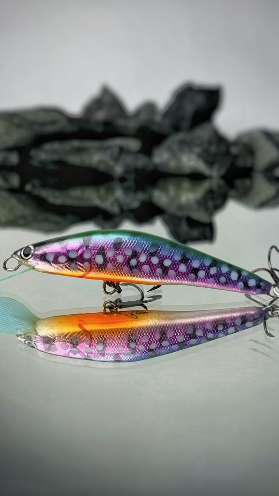 Trout minnow hand-made lure from balsa wood, surface aluminum foil, stainless thru wire construction, and super strong fiberboard lip.