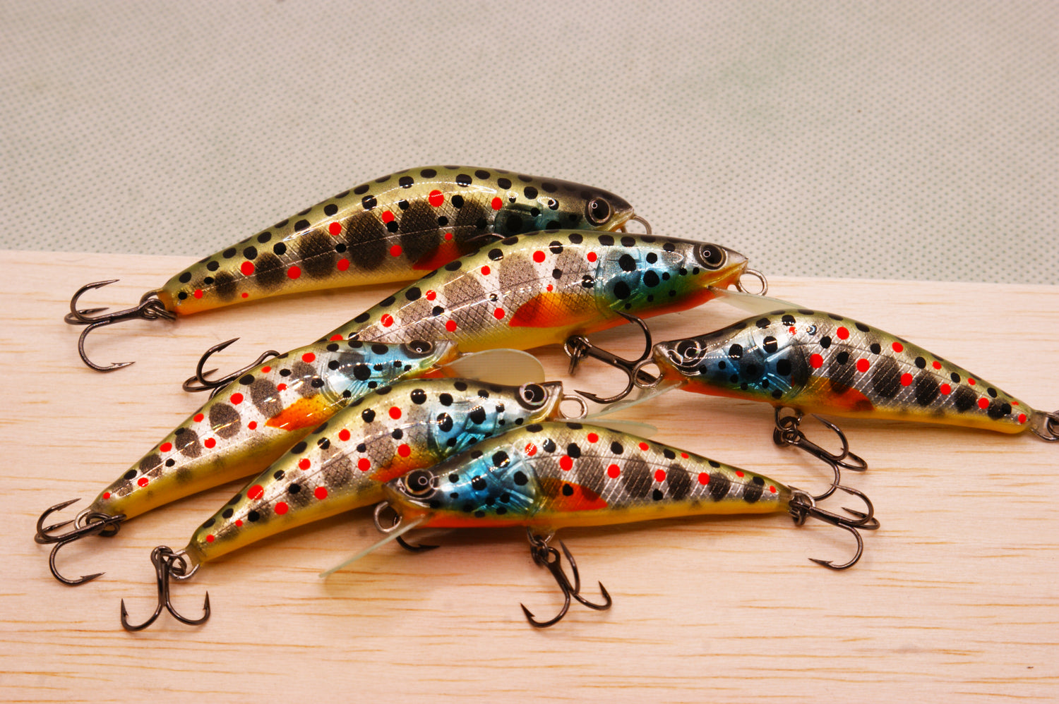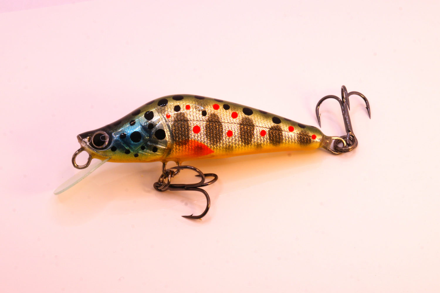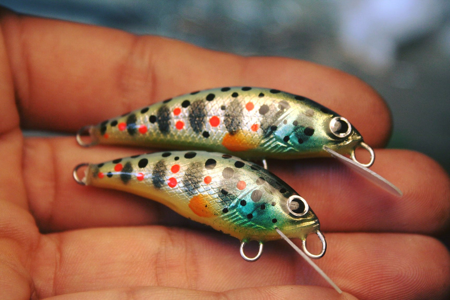 Trout minnow hand-made lure from balsa wood, surface aluminum foil, stainless thru wire construction, and super strong fiberboard lip.